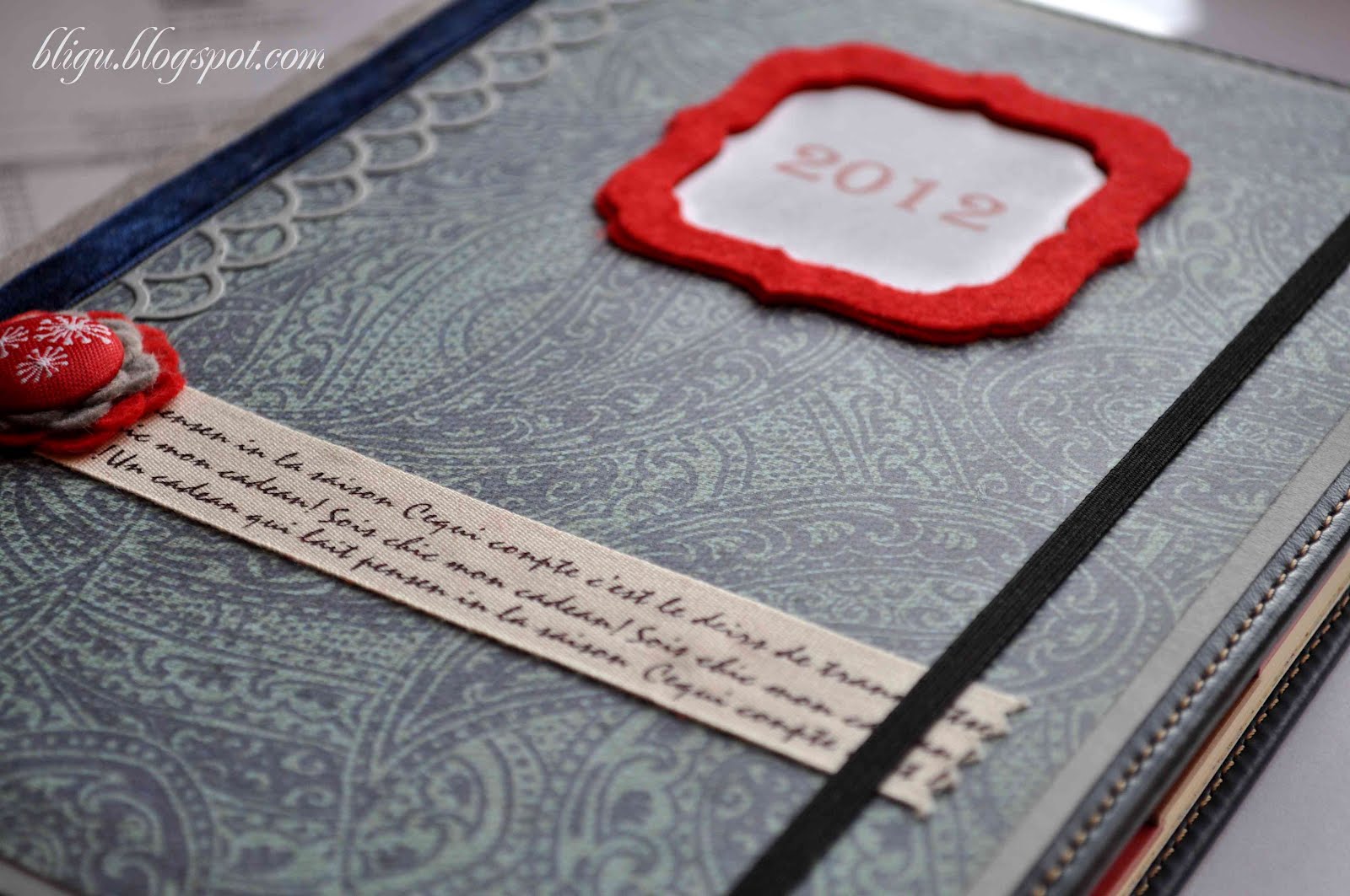 Kalendarz, dość sporych rozmiarów - pomiędzy A4 i A5, który zgodnie z wytycznymi obecnej właścicielki miał być w ciemnych kolorach i bez okazałych, przestrzennych ozdób. Miałam też przymocować gumkę, pomagającą zamknąć kalendarz, tak, aby nie wysypały się z niego luźne notatki, kartki. W środku dodałam też kieszonkę na ważniejsze zapiski. Te wymogi to ze względu na planowane intensywne, całoroczne używanie - to kalendarz biznesowy.