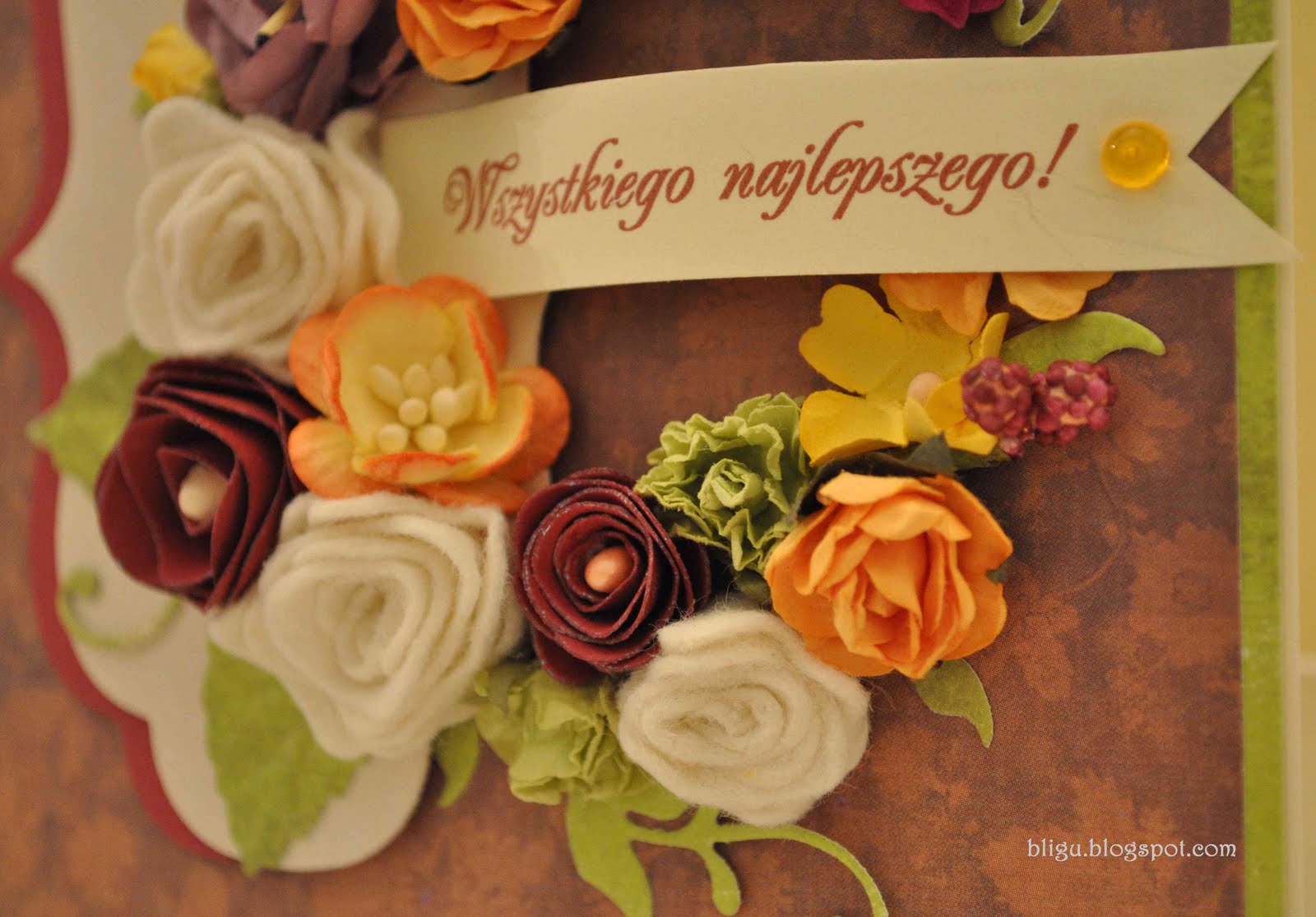 Kwiatki częściowo gotowe, częściowo moje. Angielskie róże, wycięte w kremowym filcu oraz bordowym papierze, zwijałam sama ;)