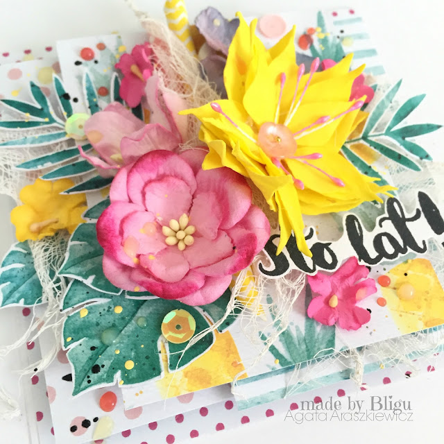dodaję kwiaty, papierowe słomki, delikatne cekiny oraz lekkie chlapnięcia tuszami.